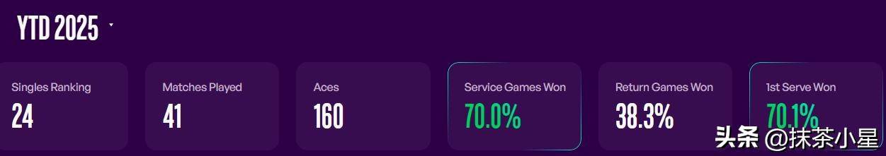 对于郑钦文而言,在一发进球率300 的情况下,还能在一发得分率上进入到Top15,这也说明,发球对于郑钦文的重要程度。可以毫不夸张地说,只要发球在手,郑钦文就足以和任何一位顶级球员对抗。而手肘伤势的恢复程度,发球端能否再上一个台阶,就是郑钦文能否迅速收复失地的重中之重!